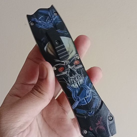 Precision, Power, and Tactical Performance Looking for a premium OTF knife in Pakistan? This Blue Skull OTF Knife (Out-the-Front) is built for tactical enthusiasts, collectors, and everyday carry (EDC) users. Featuring a smooth dual-action mechanism, it deploys and retracts effortlessly, making it an ideal choice for quick access and reliability. Why Choose This OTF Knife? Designed for durability and precision, this knife boasts a 440 stainless steel blade, ensuring long-lasting sharpness and corrosion resistance. The ergonomic plastic nylon fiber handle provides a secure grip, making it comfortable for extended use. Key Features: ✔ Lightweight & Easy to Use Effortless handling for EDC and tactical use✔ Dual-Action Mechanism Quick deployment and retraction✔ Blade Material: 440 Stainless Steel Sharp, durable, and corrosion-resistant✔ Handle Material: Plastic Nylon Fiber Lightweight and impact-resistant✔ Glass Breaker Stub Emergency-ready for breaking glass✔ Pocket Clip Secure attachment for easy carrying Specifications: ✔ Overall Length: 9 inches✔ Blade Length: 3.5 inches✔ Blade Width: 1 inch✔ Handle Width: 1.2 inches✔ Blade Thickness: 0.3 cm✔✔ Weight: Approx. 120g Perfect for Tactical & Everyday Use as OTF Knife Whether you're an EDC carrier, survivalist, or collector, this Black OTF Knife delivers unmatched performance and reliability. Ideal for camping, self-defense, or display, its a must-have for any knife enthusiast. Legal Disclaimer: ✔ Must be 18 years or older or have parental permission to purchase.✔ By purchasing, Buyer accepts all responsibility and liability for use and/or misuse of this item and agrees to abide by all laws that apply to their area regarding possession and use of items. Order Your Blue Skull OTF Knife Today! Experience the best OTF knife in Pakistansleek, tactical, and built for precision. Limited stock availableget yours now!