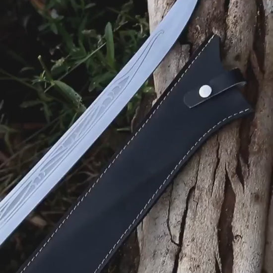 The blade is made from high-quality stainless steel, offering durability, corrosion resistance, and a polished finish ideal for long-term display. The engraved steel handle adds visual depth while providing a solid, comfortable grip. A handmade leather cover is included for protection and presentation.