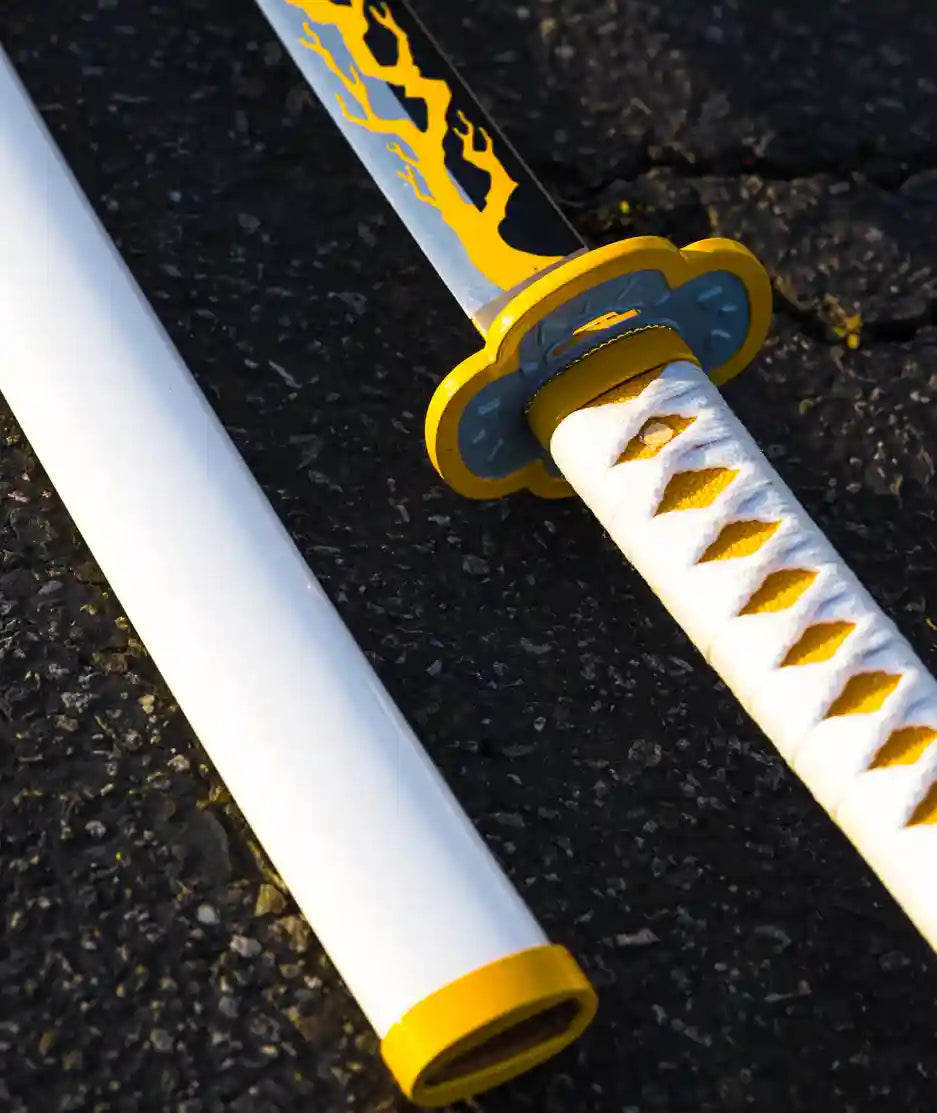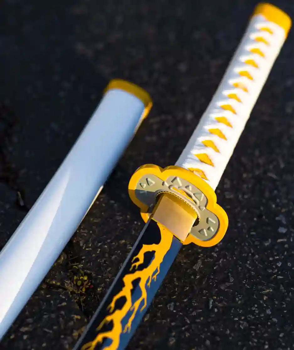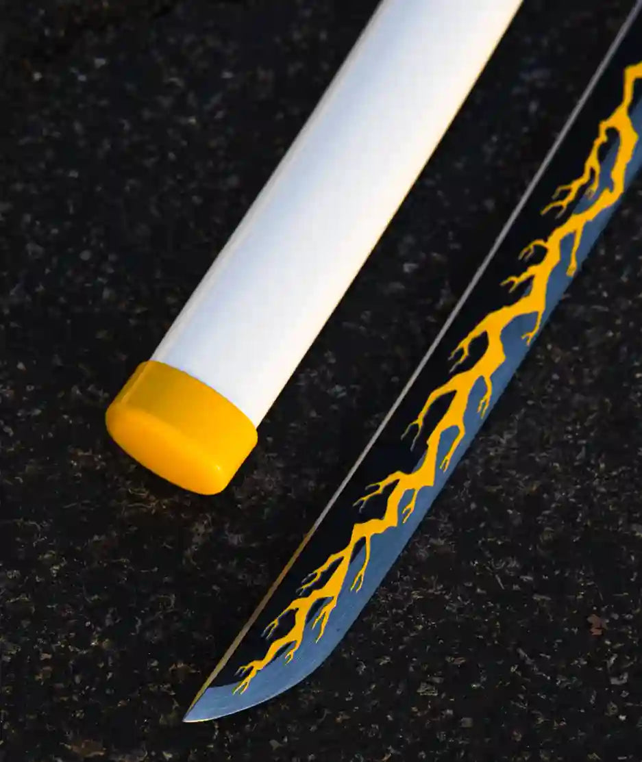 Blade size: 26.5inch Handle Size: 10.5inch Overall Size: 40inch Yellow Lightning Effect on Blade hardwood handle Delivery Time: 15-20 Days (Pre-Payment Required) This handmade replica is sheathed in a white hardwood with gold fittings at each end. White and gold detailing embellish the hilt and clover-shaped handguard, while a bright yellow lightning streak runs along the entire length of the blade.